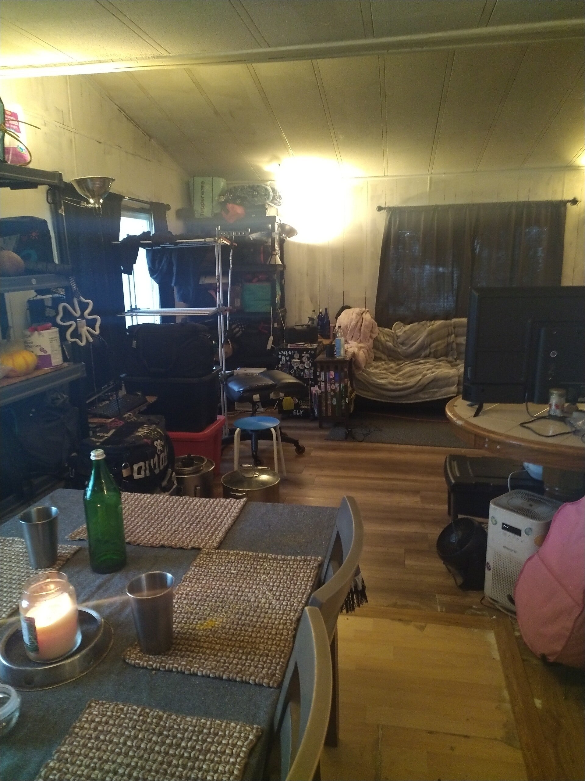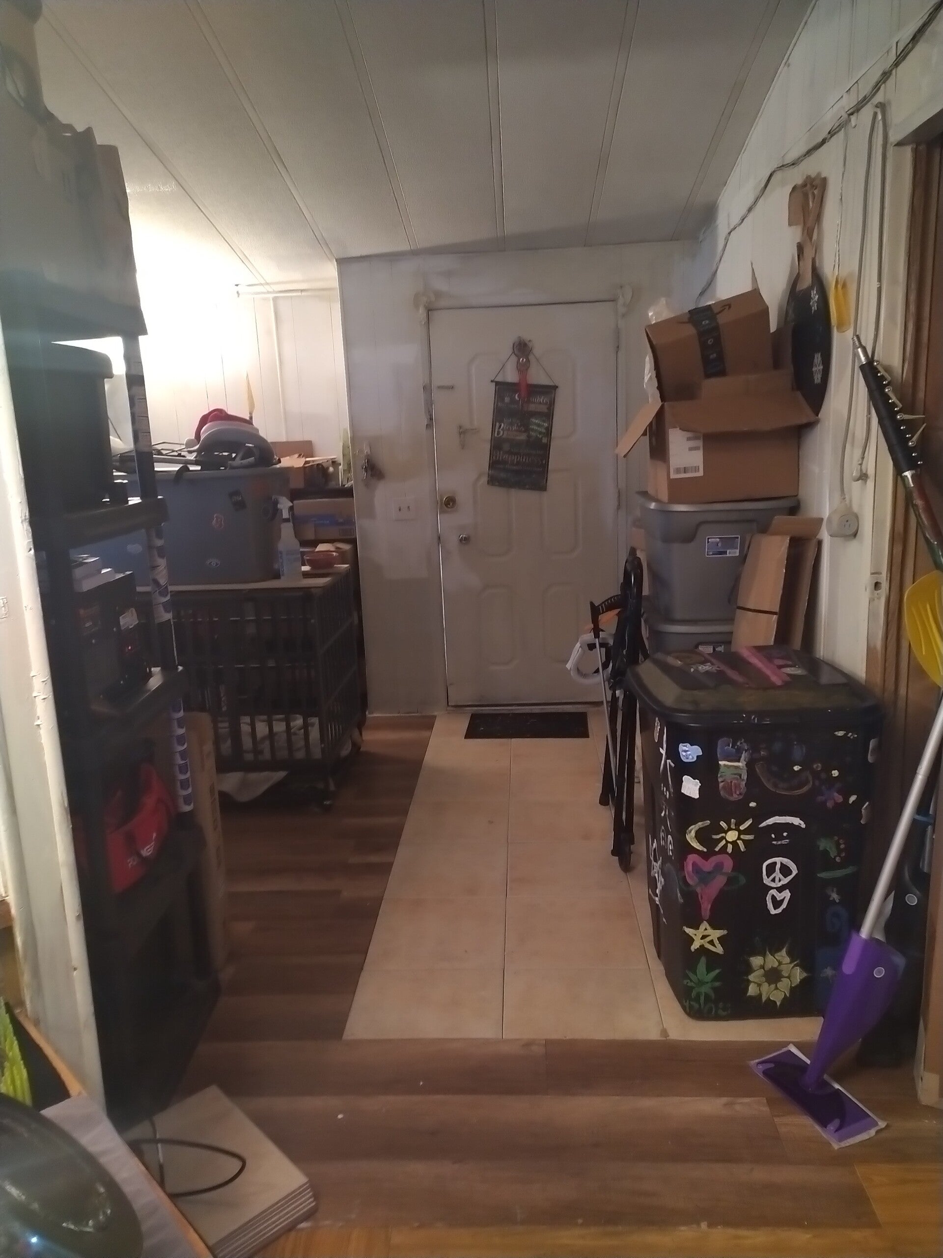 The spacious vaulted living room and entry way allow for many floor plans and plenty of room for large couches , pet enclosures , tvs, entertainment centers or whatever you may want for your space .